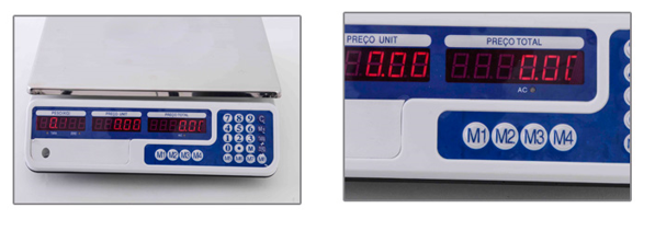 A maioria das balanças identificadas sem aprovação de modelo tem quatro botões “M” de memória (conforme imagens abaixo). Outras irregularidades constatadas são: uso da marca do fabricante e de selos não originais; uso de selo do Inmetro que não existe; e falsificação de selo de verificação do Inmetro, com coloração e tamanho diferentes do padrão estabelecido pelo órgão metrológico.