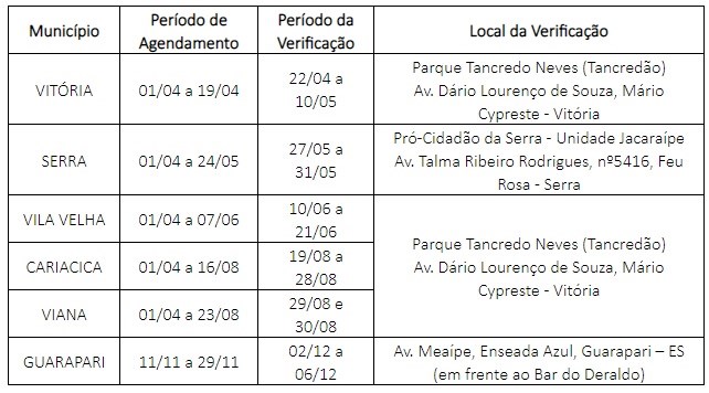 As verificações serão realizadas entre os dias 01 a 30 de abril, por região, conforme tabela a seguir: